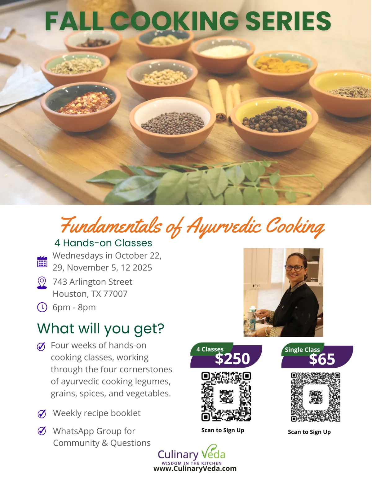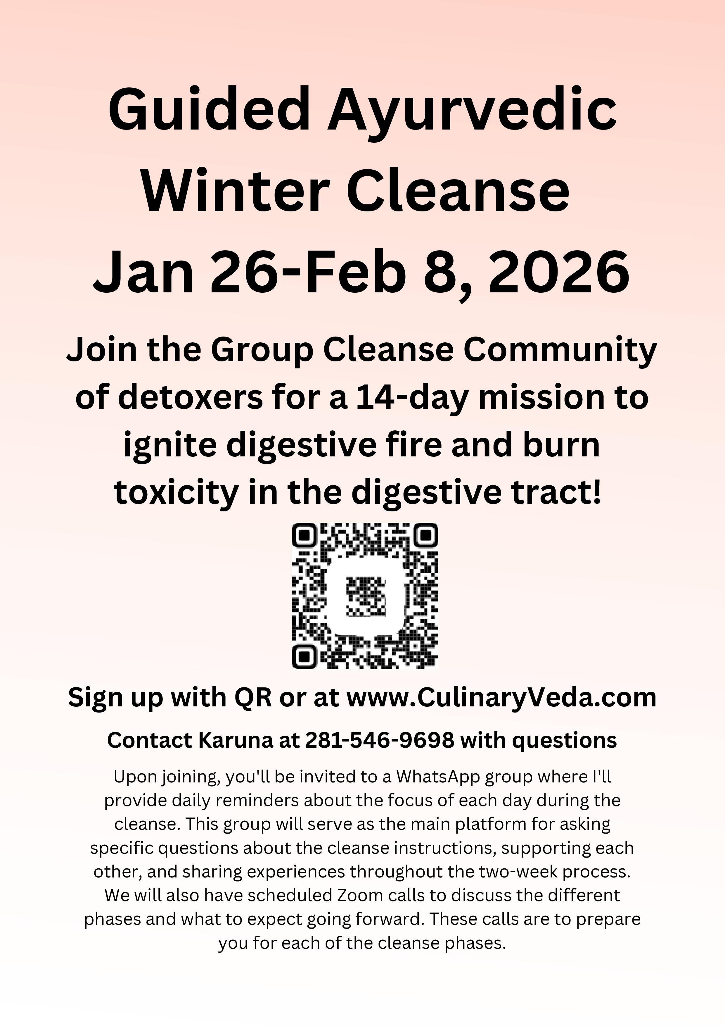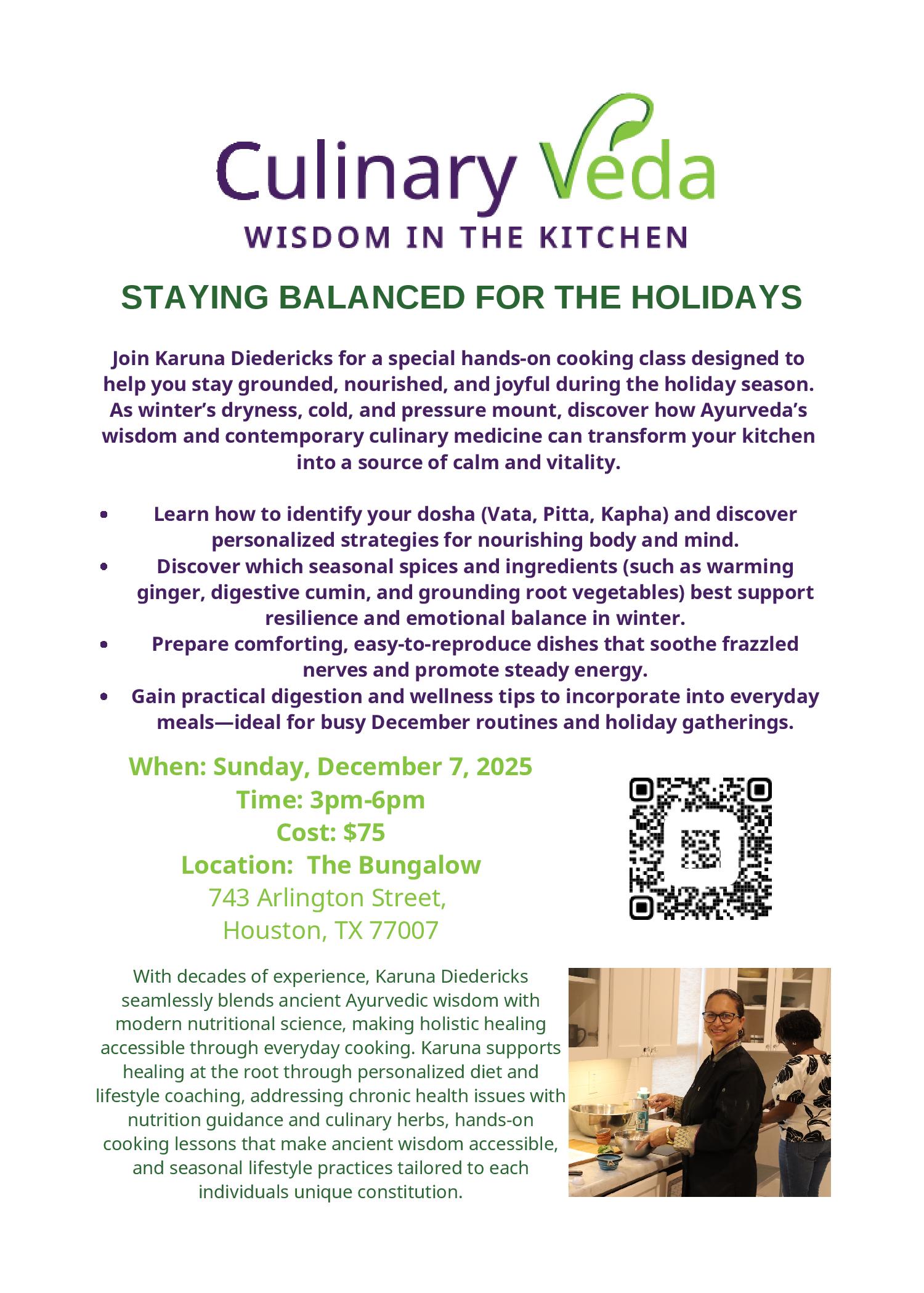 Previously, she launched Karuna’s Kitchen, a plant-based meal service rooted in Ayurvedic nutrition, which became a trusted source of nourishing, intentional food in the Houston wellness community. Today, through Culinary Veda, she continues her mission to make Ayurvedic healing accessible and sustainable, helping others find balance, vitality, and connection through the power of food and daily ritual.